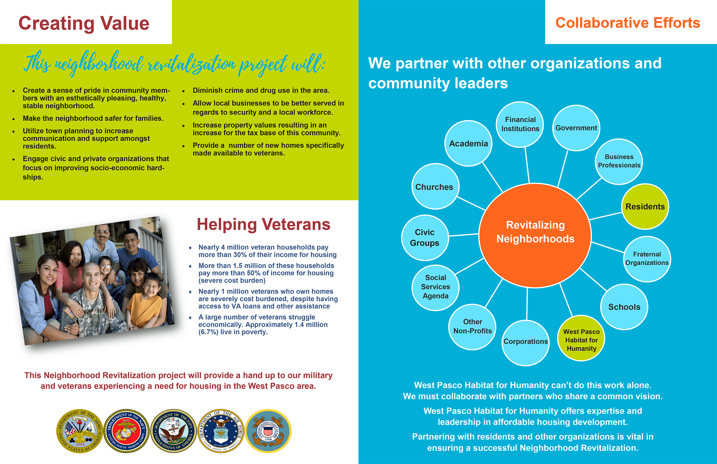 This project presented the rundown of a proposed neighborhood revitalization project. Using photographs and infographics, the booklet shows the needs of the community and breaks down the finances that will be needed to address the current squalid living conditions. West Pasco Habitat for Humanity highlights their collaboration with the local community and organizations in bright greens and blues, altogether creating an accessible and clear project guide for their partners.